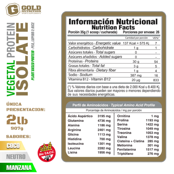 VEGETAL PROTEIN ISOLATE Está desarrollada a base de un blend de proteína de arvejas y arroz , adecuadamente aislada logrando conseguir un aminograma completo en los nueve aminoácidos esenciales y aún mejor, viene fortificada con Vitamina B12