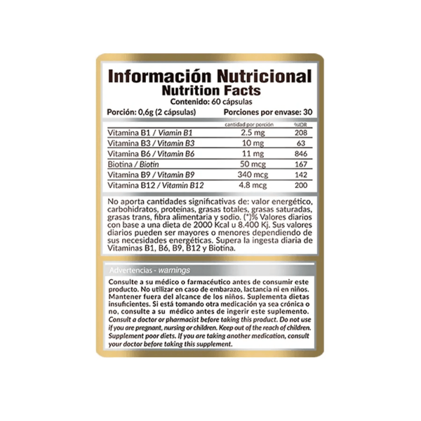 B-COMPLEX GOLD es un compuesto de 6 vitaminas del grupo B que trabajan en forma sinérgica en la producción de energía.